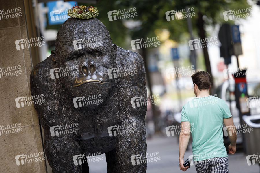 Ein Gorilla, der Vorfahre der Menschen, steht als Bronze-Figur vor einem Souvenirladen in der Altstadt. Köln, 18.06.2019