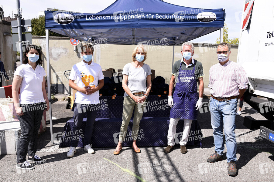 Anne Hübner, Ole Wulff, Hannelore Kiethe, Paul Breitner und Boris Schwartz bei der Übergabe von Schulstart-Spenden der Firma Amazon an 2300 sozial benachteiligte Kinder an der Münchner Tafel in der Großmarkthalle. München, 28.08.2020