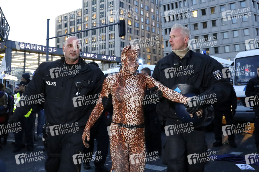 Aktivisten der Klimabewegung 'Extinction Rebellion' blockieren den Potsdamer Platz, die Polizei beginnt mit der Räumung. Berlin, 07.10.2019