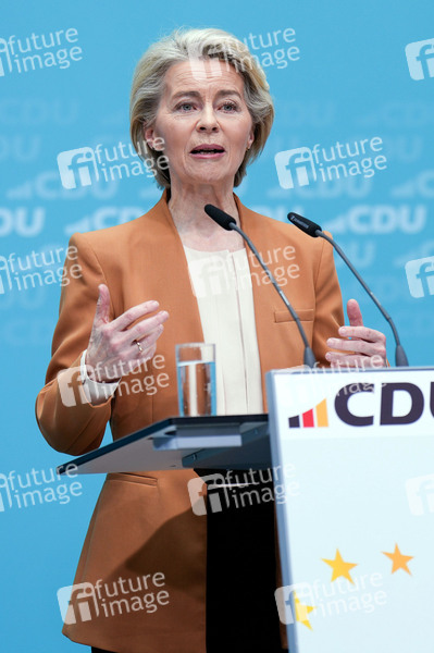 Ursula von der Leyen bei einer Pressekonferenz nach der Bundesvorstandssitzung der CDU mit der Bekanntgabe der Nominierung von Ursula von der Leyen als Spitzenkandidatin für die Europawahl im Konrad-Adenauer-Haus. Berlin, 19.02.2024