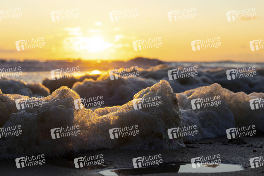 Nordsee, Sylt, nordfriesische Insel, Küste, Strand, Wellen, Reise, Urlaub, Tourismuns, Schaum, Algenschaum, Brandung, Sonnnenuntergang, Symbolbild, Themembild