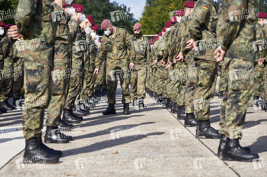 Soldaten bei einem Appell für die Soldatinnen und Soldaten der Evakuierungsmission in Kabul und dem Feierlichen Gelöbnis von Rekruten des Fallschirmjägerregiments 31 in der Fallschirmjägerkaserne Seedorf. Seedorf, 22.09.2021