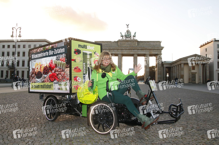 Maren Gilzer bei der Präsentation ihres gesundheitsfördernden Superfoodsaftes von multishot am Brandenburger Tor. Berlin, 20.11.2020