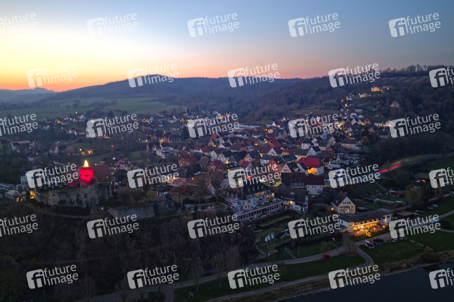Advent, Adventszeit, Weihnachtszeit, Weihnachten, Christmas, X-Mas, Kerze, Riesenkerze, Weserbergland, Eversteiner Burg, Sehenswürdigkeit an der Weser, Ruine, Höhenburg, Luftaufnahme, Drohnenaufnahme