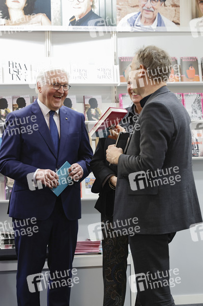Frank-Walter Steinmeier, Christina Knecht und Jo Lendle am Stand vom Carl Hanser Verlag auf der Leipziger Buchmesse 2024 auf dem Messegelände. Leipzig, 21.03.2024