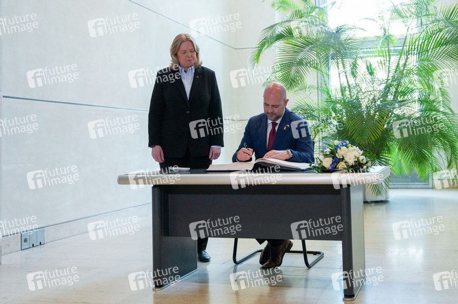 Bärbel Bas und Amir Ohana beim Eintrag ins Gästebuch anlässlich des Besuches des israelischen Parlamentspräsidenten im Deutschen Bundestag. Berlin, 08.04.2024