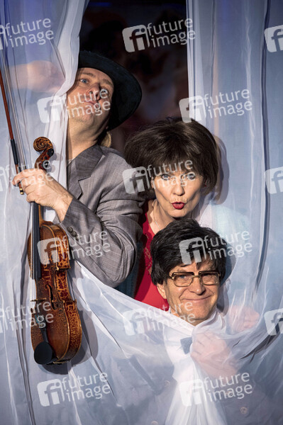 Florian Mayer, Josephine Hoppe und Dirk Neumann in der Theatervorstellung 'Das Ei ist hart! Ein Loriot-Abend' in Hoppes Hoftheater. Dresden, 16.01.2022