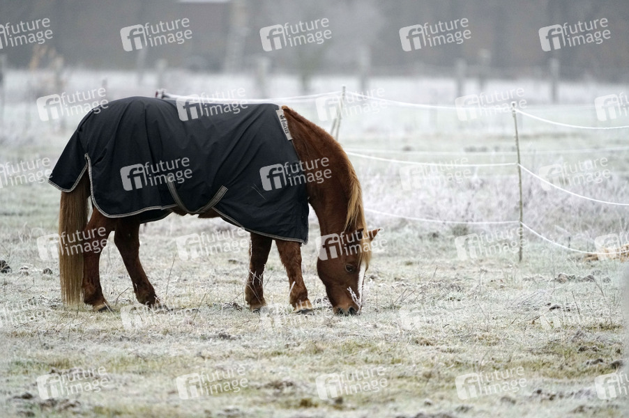 Frost, Futter, Gras, Koppel, Natur, Pferd, Pony, Raureif, Reif, Tier, Weide, weiß, Wetter, Winter, Nebel, Pferd, Pferde, Zaun, Koppelzaun, Jahreszeit, Symbolfoto, Symbolbild