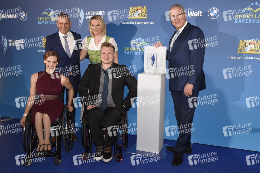 Anna Schaffelhuber, Tobias Angerer, Hilde Gerg, Nikolai Sommer und Joachim Herrmann bei der 20. Verleihung des Bayerischen Sportpreises 2021 in der BMW-Welt München. München, 06.11.2021