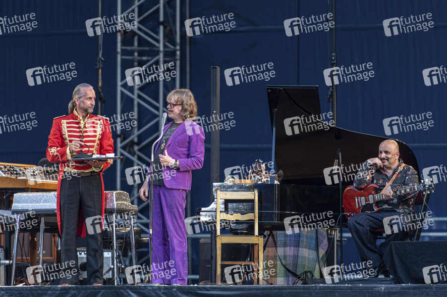 Der Teekoch Bodo Oesterling, Helge Schneider und Sandro Giampietro live mit dem Programm 'Let's Lach' bei den Filmnächten am Elbufer. Dresden, 16.07.2021