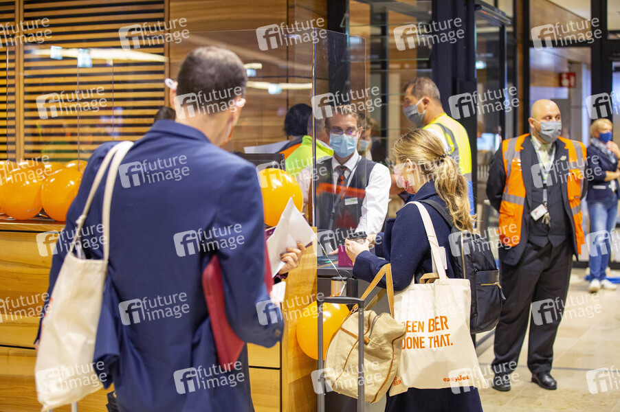Allererster kommerzieller Abflug vom BER mit easyJet nach London Gatwick am Gate im Non-Schengen-Bereich des Terminal 1 im Flughafen Berlin Brandenburg. Schönefeld, 01.11.2020
