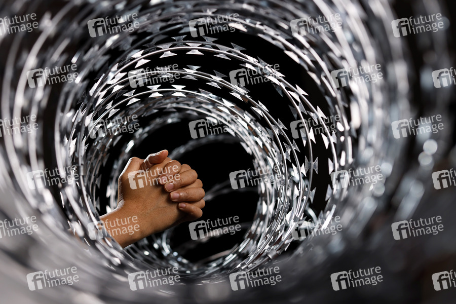 Eine Frau faltet die Hände in einem Stacheldrahtzaun. Millionen Flüchtlinge sind Opfer von moderner Sklaverei. Am 10. Dezember wird ihr Schicksal thematisiert beim Tag der Menschenrechte. (Themenbild, Symbolbild)