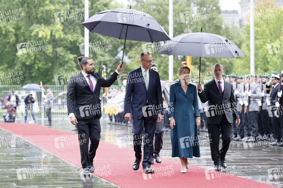 Friedrich Merz und Karin Keller-Sutter beim Empfang der Bundespräsidentin der Schweiz mit militärischen Ehren zu einem gemeinsamen Gespräch mit anschließendem Pressestatement im Bundeskanzleramt. Berlin, 02.09.2025