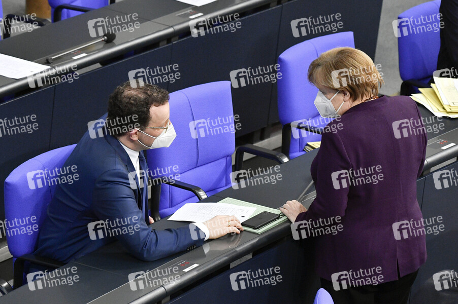 Jens Spahn und Angela Merkel in der 205. Sitzung des Deutschen Bundestages im Reichstagsgebäude. Berlin, 27.01.2021