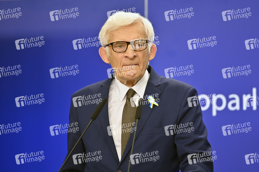 Jerzy Buzek bei einer Pressekonferenz zur Trilog-Vereinbarung zur Gasspeicherung im Europäischen Parlament. Brüssel, 19.05.2022