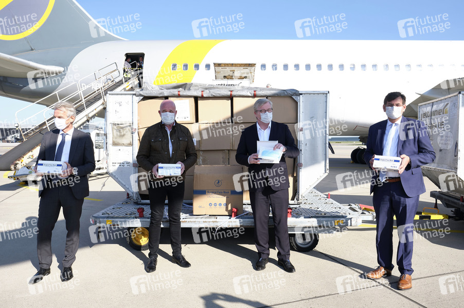 Ralf Teckentrup (CEO von Condor Flugdienst), Bernd Osterloh (Vorsitzender des Gesamt- und Konzernbetriebsrats der Volkswagen AG), Bernd Althusmann (Niedersächsischer Minister für Wirtschaft) und Gunnar Kilian (Vorstandsmitglied der Volkswagen AG) - Volkswagen empfängt Luftfracht mit 5 Million Schutzmasken und medizinische Hilfsmaterialien aus China auf dem Hannover Airport. Hannover, 26.04.2020