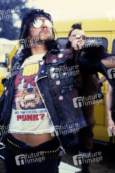 Mark 'Zodiac Mindwarp' Manning und Geoff 'Cobalt Stargazer' Bird von Zodiac Mindwarp and the Love Reaction auf dem Reading Rock Festival 1986 an der Richfield Avenue. Reading, 24..08.1986