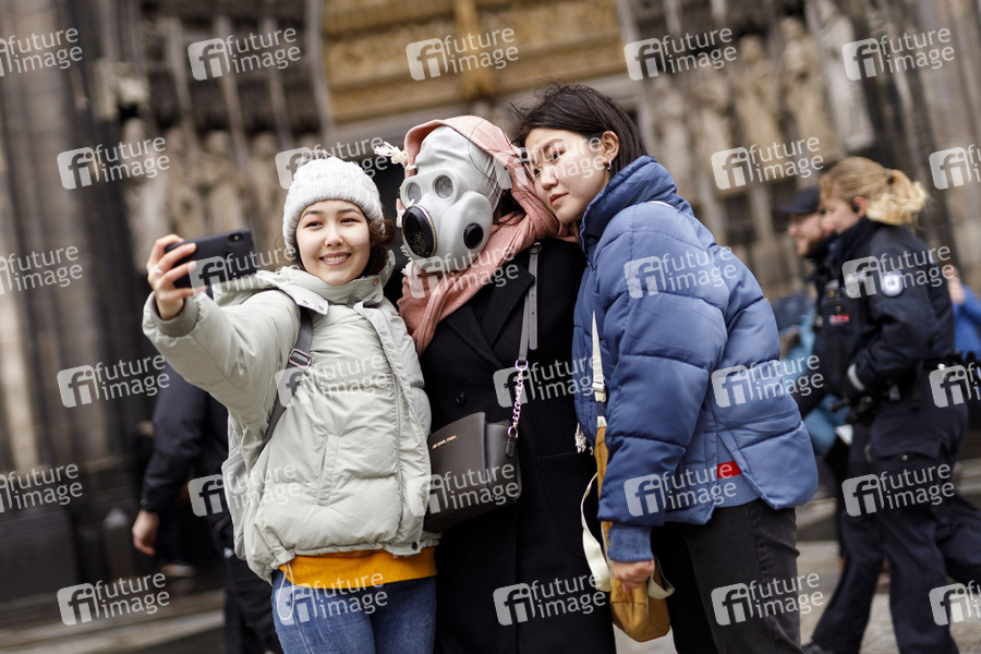 Touristen in Köln, wo nun der erste Coronavirus-Fall von Sars-CoV-2 bzw. Covid-19, bekannt wurde, posieren scherzhaft für ein Selfie mit einer Gasmaske am Kölner Dom. Köln, 29.02.2020
