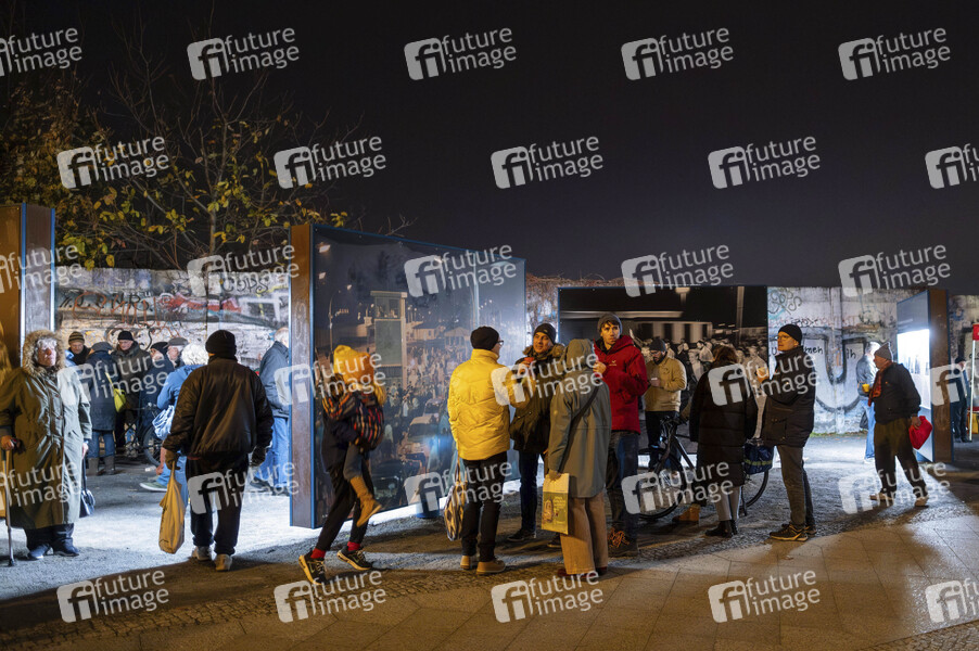 Anlässlich des 35. Jahrestags des Falls der Berliner Mauer Mauer versammeln sich Anwohner und Besucher an der Bornholmer Straße in Höhe der Bösebrücke um an den Mauerfall zu erinnern. Hier befand sich der Grenzübergang, an dem am 9.November 1989 die Grenz nach Westerberlin als erstes geöffnet wurde. Ein kleine Ausstellung erinnert daran. Berlin, 09.11.2024