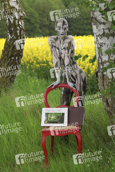 Nature Art: Rapsbirken Bodypainting und Photoshooting. Model Anastasia mit dem Fotobildband 'Bodypainting in Nature - Farbige Symbiosen' von Jörg Düsterwald. Behrensen, 14.05.2025 - Bodyart-Künstler: Jörg Düsterwald
