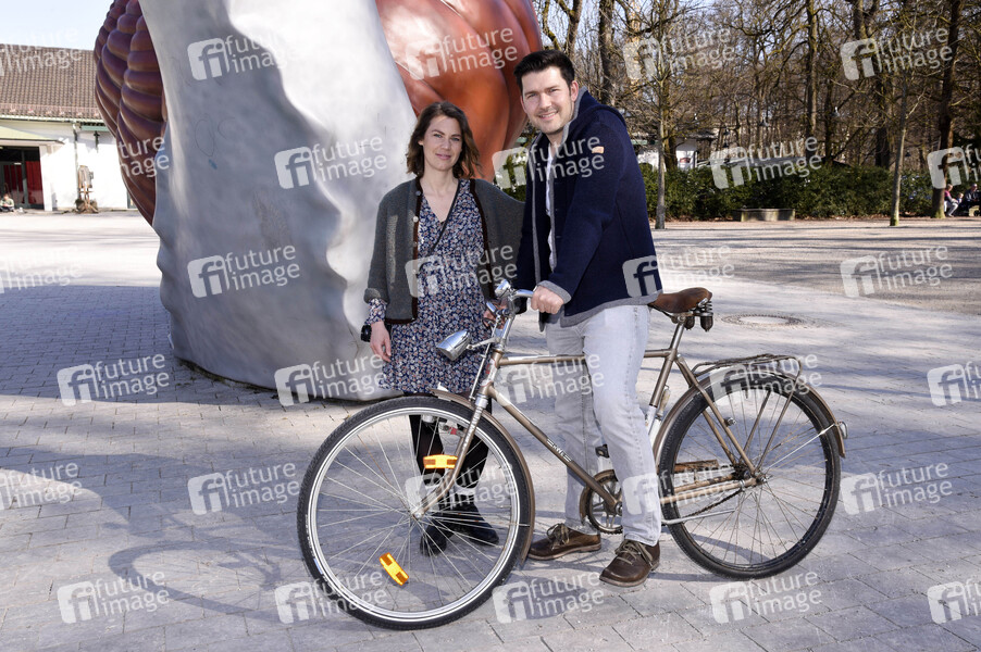 Christina Schmideder und Max Kronseder (DeSchoWieda) beim Videodreh zum Lied 'Radlg'fahrn und G'schmissn' der Guten A-Band im Bavariapark und auf der Theresienwiese. München, 26.03.2021