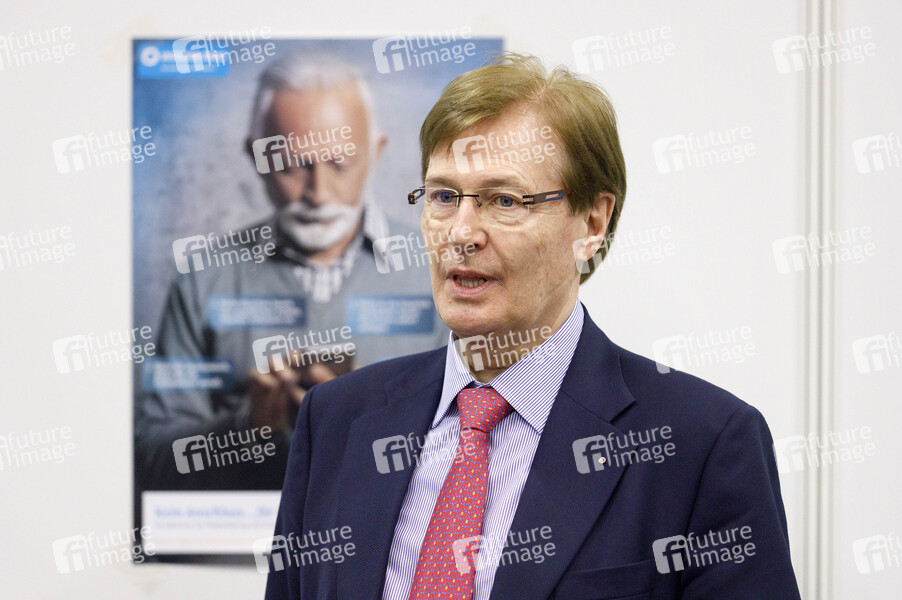 Peter Biesenbach auf der Pressekonferenz: Der NRW-Justizminister auf Werbetour in Köln für die Kampagne des Weissen Rings zum Thema 'Kein Anschluss für Betrüger am Telefon' im Impfzentrum in den Messehallen. Auch dort sollen Plakate die alten Menschen vor der Enkeltrick-Masche warnen, die ohnehin die Messehallen für einen Impftermin aufsuchen. Köln, 05.02.2021