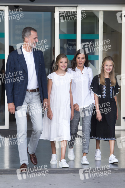 König Felipe VI. von Spanien, Prinzessin Sofia von Spanien, Königin Letizia von Spanien und Prinzessin Leonor von Spanien besuchen Juan Carlos nach seiner Herzoperation im Hospital Universitario Quirónsalud Madrid. Pozuelo de Alarcón, 26.08.2019