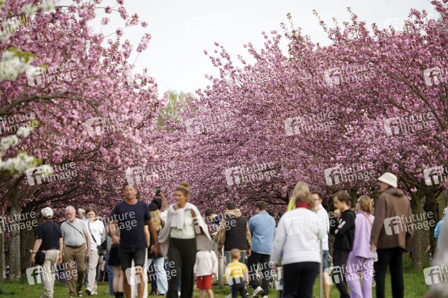 Blühende Japanische Kirschbäume entlang der TV-Asahi-Kirschblütenallee am Berliner Mauerweg im Stadtteil Lichterfelde und Teltow. Berlin, 07.04.2024
