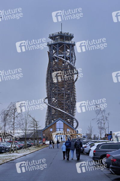 Der Harzturm ist ein 65 Meter hoher Aussichtsturm im Harz. Über eine Treppe oder einen Aufzug sind auf 45 Metern Turmhöhe zwei Panoramaplattformen, ein Skywalk mit gläsernem Boden und der Startpunkt einer 110 Meter langen Rutsche zu erreichen. Die hölzerne Turmschraube imitiert einen hohlen, drehwüchsigen Baumstamm. Dafür haben sich die österreichischen Planer, Architekt Dietmar Kaden und Tragwerksplaner Markus Lackner, das intelligente Naturdesign des aufgehenden Fichtenzapfens zum Vorbild genommen. Torfhaus, 25.02.2024