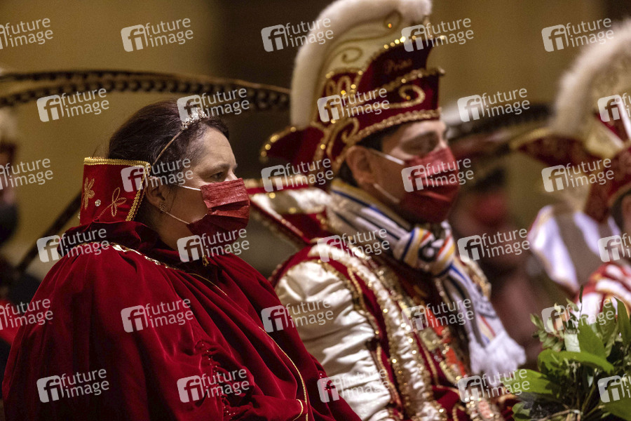 Der karnevalistische Gottesdienst fand unter 3G-Bestimmungen in der Severikirche auf dem Erfurter Domberg statt. Pfarrer Michael Neudert, gab den Karnevalisten, einschließlich den Prinzenpaaren Christian II. und Verena II. und den Kindern Luca I. und Noelanie I. den Segen für die anstehende Kampagne.(Personen im Bild: Prinzessin Verena II., Prinz Christian II.). Erfurt, 16.01.2022