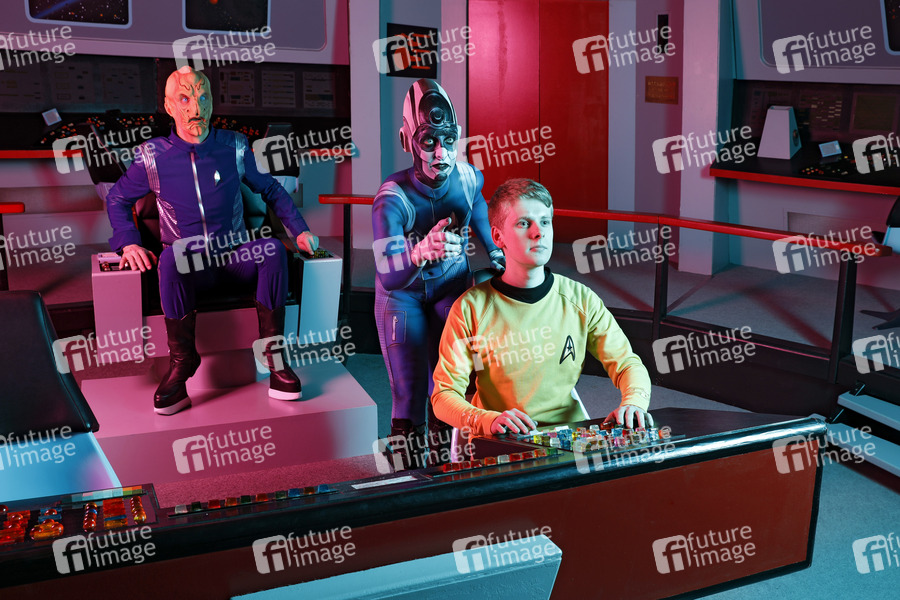 GEEK ART - Bodypainting meets SciFi, Fantasy and more: 'Star Trek Discovery' Photoshooting mit Model Barbara Wegener als Airiam, Enrico Lein als Saru und Paul Skupin als Steuermann auf der Brücke vom Raumschiff Enterprise im Filmwelt Center. ad Münder, 18.04.2019 - Ein Projekt des Fotografen Tschiponnique Skupin und des Bodypainters und Transformakers Enrico Lein