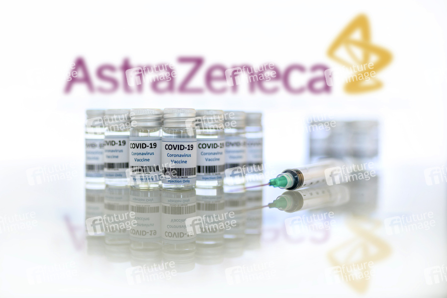 Impfdosen und Impfspritzen stehen auf einem Tisch vor dem AstraZeneca-Logo. (Themenbild, Symbolbild)