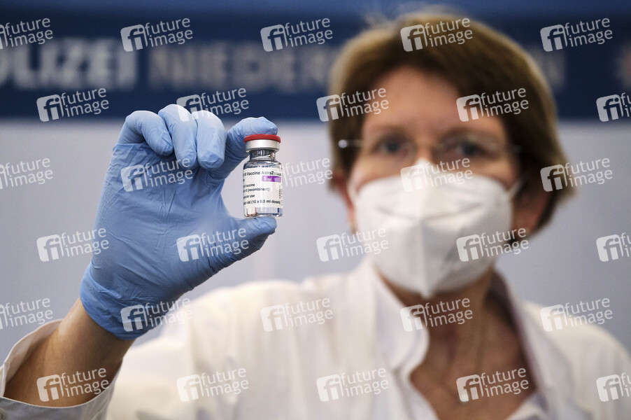 Die Leiterin des Polizeimedizinischen Dienstes Dr. Jutta Schinz mit dem Impfstoff AstraZeneca beim Start der Impfungen für Einsatzkräfte aus den geschlossenen Einsatzeinheiten der Zentralen Polizeidirektion Niedersachsen (ZPD) in der Tannenbergallee. Hannover, 04.03.2021