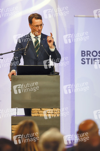 Hendrik Wüst bei der Präsentation der Wanderausstellung 'Woanders ist überall' mit Gemälden über die Geschichte und Kultur des Ruhrgebiets von Dieter Nuhr in der Kreuzkirche. Essen, 28.05.2024