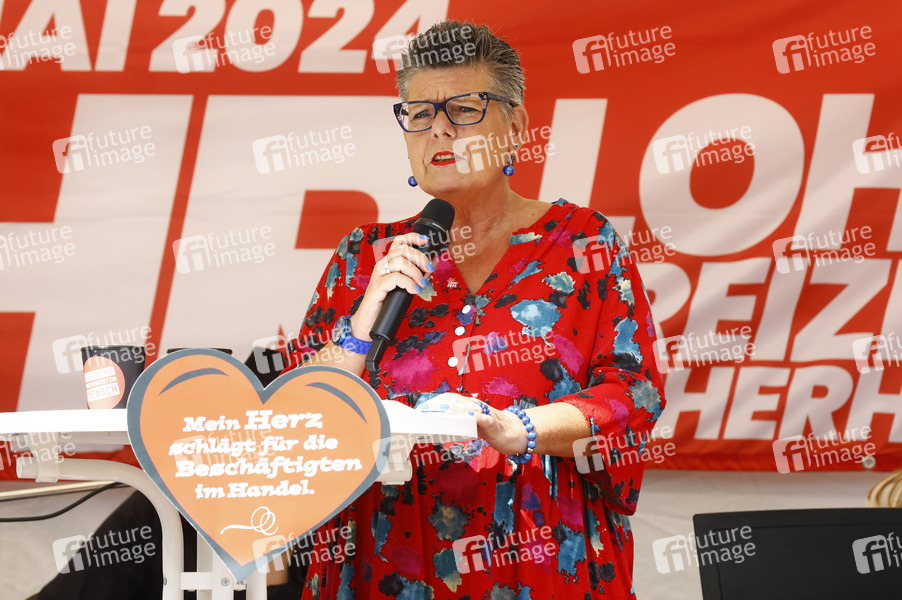 Tag der Arbeit, Mai-Demonstranten, Maidemo, Maidemonstranten, Maidemonstration, Erster Mai, Feiertag, Gehalt, Gehälter, Gewerkschaft, Deutscher Gewerkschaftsbund, Feiertag, Kundgebung, Tag der Arbeiterbewegung, Internationaler Kampftag der Arbeiterklasse, Maifeiertag, Gewerkschaften, Kundgebung, Lohn, Löhne, Arbeitnehmerrechte, Mai-Demo, Politik, Gewerkschafterin, Geschäftsführerin Landesfachbereich Handel von ver.di NRW