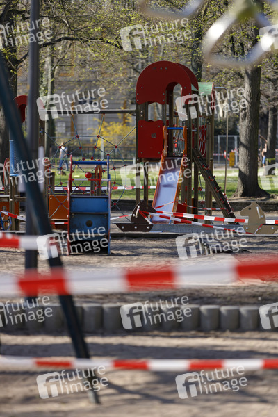 Abgesperrte Spielplätze, wie hier auf der Bonner Hofgartenwiese, sollen im Zuge der Lockerung der Corona-Maßnahmen in NRW bald wieder öffnen dürfen. Bonn, 01.05.2020