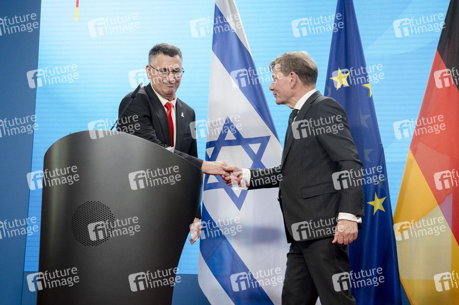 Gideon Sa'ar und Johann Wadephul bei einer gemeinsamen Pressekonferenz des israelischen Außenministers und des deutschen Außenministers im Auswärtigen Amt. Berlin, 05.06.2025
