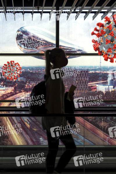 Notwendige Reisen in Zeiten von Corona. Bildmontage mit Reisenden in Flughafen Amsterdam Schiphol und einer 3D Illustration des Coronavirus vom CDC