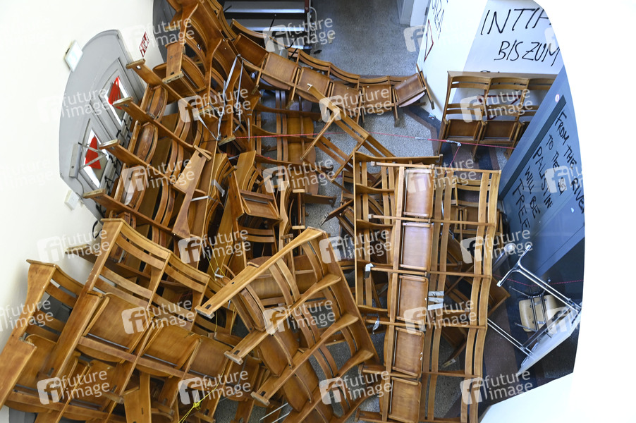 Politik, Demokratie, Protest, Zerstörung, Antisemitismus, Extremismus, Gaza-Konflikt, Hamas, Konflikt, Nahostkonflikt, Palästina, Palästinakonflikt, Terror, zerstörte Sitze, beschmierte Wände, Hass