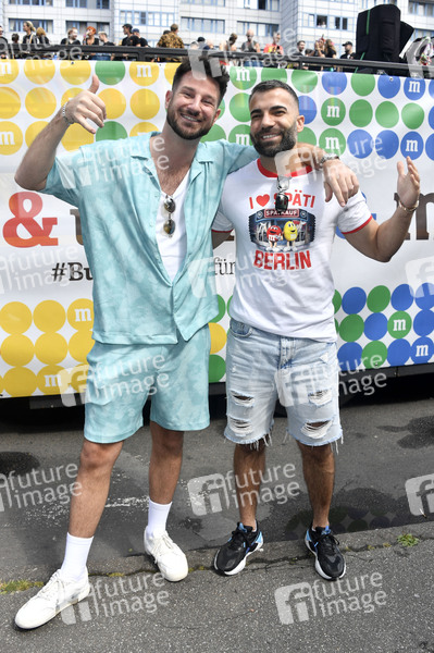 Alexander Schäfer und Rafi Rachek vor dem M&M's Truck bei der 44. Christopher Street Day Parade 2022 unter dem Motto 'United in Love! Gegen Hass, Krieg und Diskriminierung' vom Spittelmarkt auf gut sieben Kilometern über Potsdamer Platz und Potsdamer Straße zum Nollendorfplatz, von dort weiter zur Siegessäule und zum Brandenburger Tor. Berlin, 23.07.2022