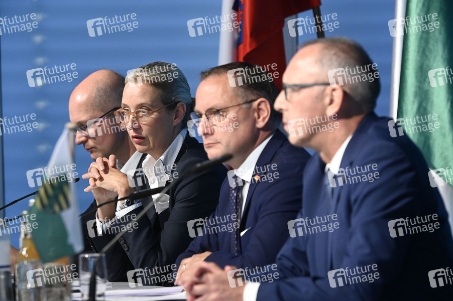 Stefan Möller, Alice Weidel, Tino Chrupalla und Jörg Urban bei der Wahlnachlese der AfD nach den Landtagswahlen in Thüringen und Sachsen in der AfD-Bundesgeschäftsstelle. Berlin, 02.09.2024