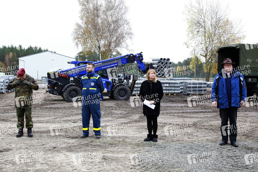Oberst Klaus Finck, Andreas Heinrich, Petra Köpping und Dr. Andreas Cramer beim Pressetermin zum Bau eines festen Zauns an der Restriktionszone zur Eindämmung der Afrikanischen Schweinepest im Truppenlager Werdeck. Krauschwitz, 11.11.2020