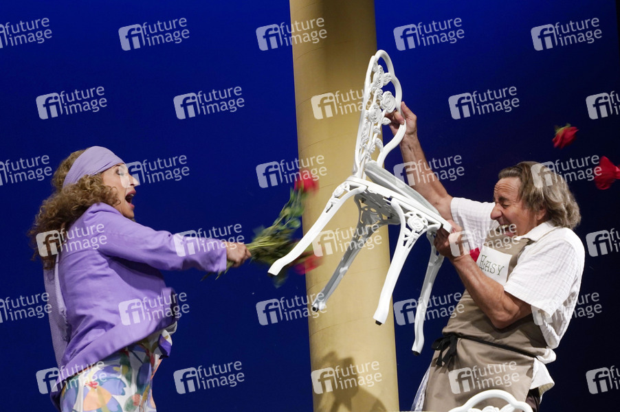 Caroline Beil und Dieter Landuris bei der Fotoprobe zum Theaterstück 'Fisch sucht Fahrrad' im Schlosspark Theater. Berlin, 14.05.2025
