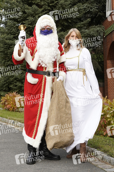 Weihnachtsmann und Engel mit Mund-Nasen-Schutz bei der Pressekonferenz mit Fototermin Christmas Garden Berlin 2020 im Botanischen Garten. Berlin, 08.10.2020