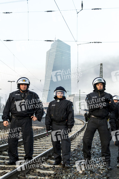Die kapitalismuskritische Blockupy-Bewegung hat zu einem Protesttag gegen die europäische Krisenpolitik aufgerufen. Anlass ist der Festakt zur Eröffnung der neuen Zentrale der Europäischen Zentralbank (EZB). Es kommt zu Ausschreitungen und Angriffe auf Polizisten. Demonstranten versuchen, das weiträumig abgesperrte Gelände der EZB zu stürmen, werden aber von der Polizei gestoppt. Frankfurt am Main, 18.03.2015