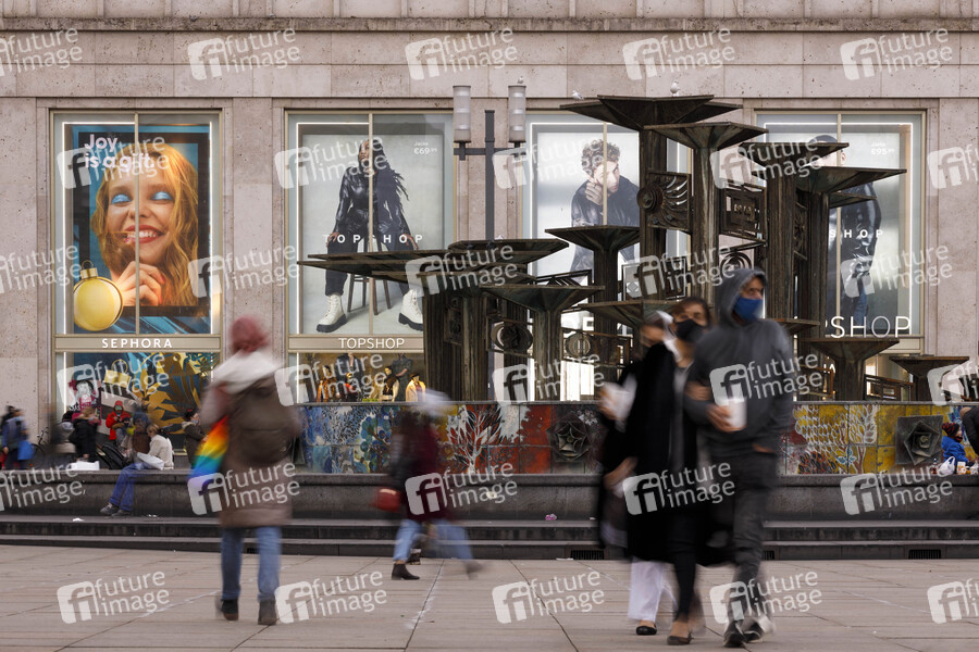 Kunden nutzen die letzte Gelegenheit vor dem Lockdown, um Weihnachtsgeschenke rund um den Alexanderplatz zu kaufen. Im Bild der Brunnen der Völkerfreundschaft und Werbeplakate eines Kaufhauses. Aufgrund der Pandemie gelten in Einkaufszonen Regeln wie Mindestabstand und Makskenpflicht. (Themenbild, Symbolbild) Berlin, 15.12.2020