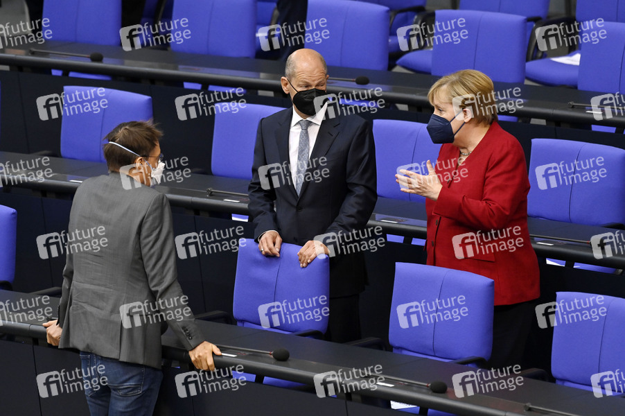 Karl Lauterbach, Olaf Scholz und Angela Merkel in der 238. Sitzung des Deutschen Bundestages im Reichstagsgebäude. Berlin, 25.08.2021