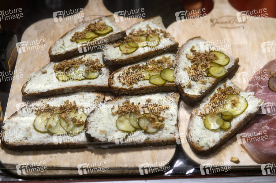 Schmalzstullen mit sauren Gurken und Röstzwiebeln auf dem Lucia Weihnachtsmarkt in der Kulturbrauerei. Berlin, 21.12.2024