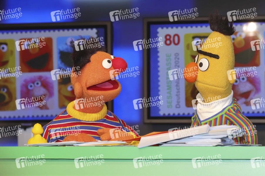 Ernie und Bert bei der Präsentation der Deutsche Post Sonderbriefmarke 'Sesamstrasse' im Sonderpostamt beim NDR Rundfunk. Hamburg, 02.03.2020