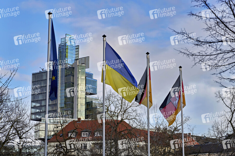 Am Trammplatz - Beflaggung öffentlicher Landesgebäude mit den Flaggen der Bundesrepublik Deutschland, des Landes Niederschsen und der Ukraine zum 2.Jahrestages des Kriegsbeginn der russichen Streitkräfte gegen die Ukraine. Die Beflaggung stellt keine Tauerbeflaggung dar. Hannover, 24.02.2024